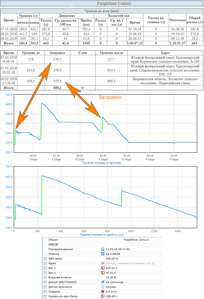 В отчете отображаются данные по заправкам в баки автомобиля, расход на 100 км. На графике отчётливо виден равномерный расход топлива при движении автомобиля. Можно заменить, что колебания топлива в баках происходят в пределах погрешности, что позволяет фиксировать заправки с точностью до 1%.